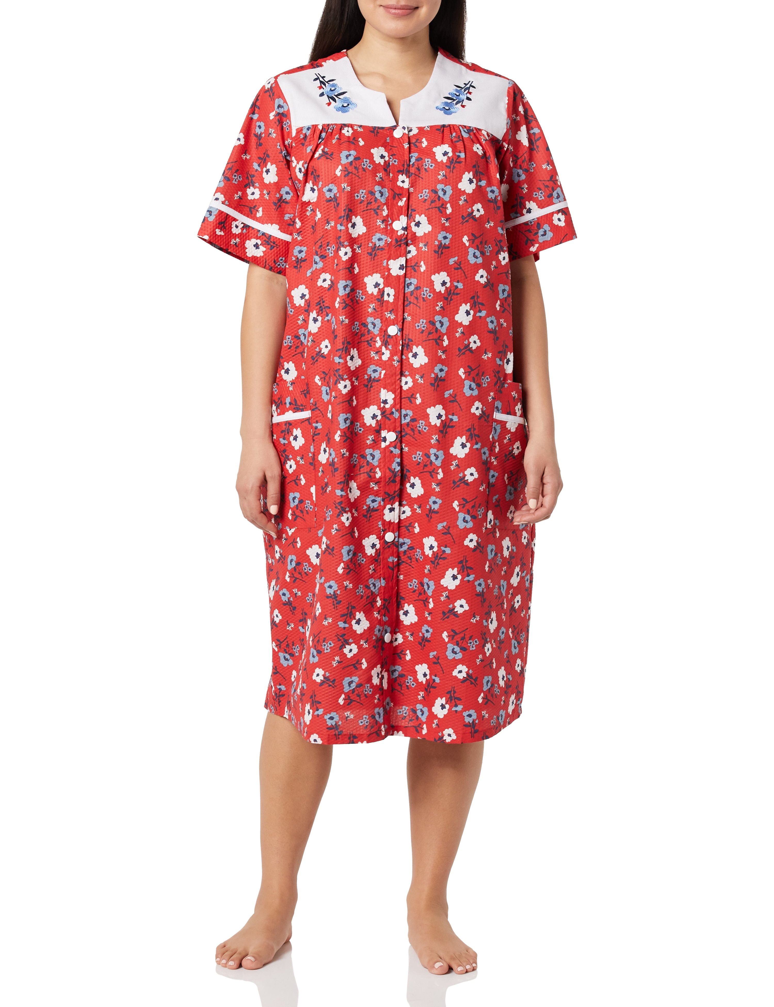 Amerimark Women S Embroidered House Coat Short Sleeve Dress With Front Pockets Red Floral 3x Walmart Com